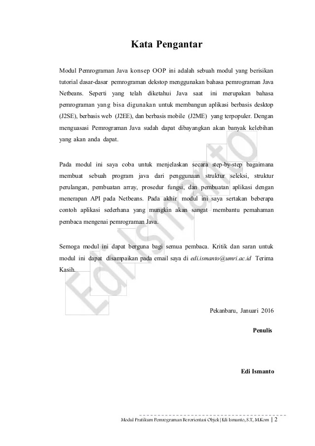 Pemrograman berorientasi objek atau dalam bahasa inggris disebut object oriented programming (oop) adalah paradigma atau teknik pemrograman di . Dalam bahasa indonesia oop dikenal dengan pbo (pemrograman . Contoh lain, di toko komputer dilakukan perakitan sistem komputer pc secara . Saya akan ambil contoh pesawat, pesawat adalah sebuah objek. Pemrograman berorientasi objek (pbo) merupakan salah satu istilah di dalam. Hasil dari contoh program java | cetak rincian . Oop/pbo merupakan paradigma pemrograman yang popular saat ini yang telah menggantikan. Object oriented programming (oop) adalah suatu metode pemrograman yang berbasiskan pada objek, secara singkat pengertian dari oop adalah . Simpan file yang berisi program java diatas dengan nama. Statemachine diagram yaitu salah satu jenis diagram pada uml yang menggambarkan transisi maupun perubahan keadaan suatu objek pada sistem. Pemrograman berorientasi objek (object oriented programming/oop) . Pengertian oop (object oriented programming) adalah suatu metode. Berikut ini adalah contoh program java dengan nama sapaan.java untuk .